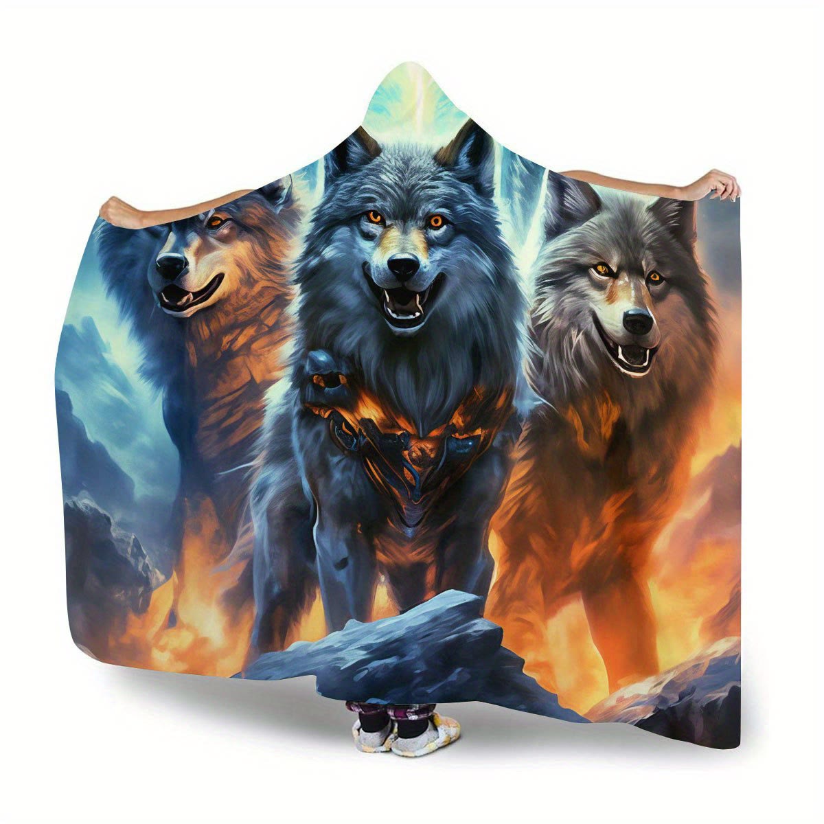 WorldNorse Fiery Ember-Clad Wolves Hooded Blanket - image 0