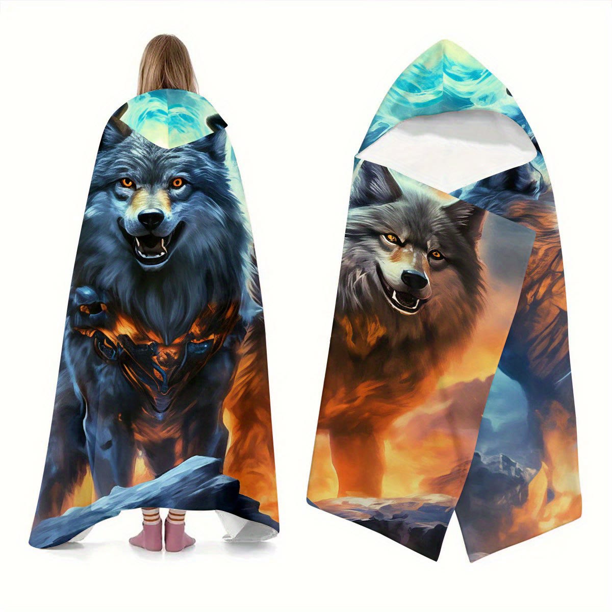 WorldNorse Fiery Ember-Clad Wolves Hooded Blanket - 150x200cm - image 1