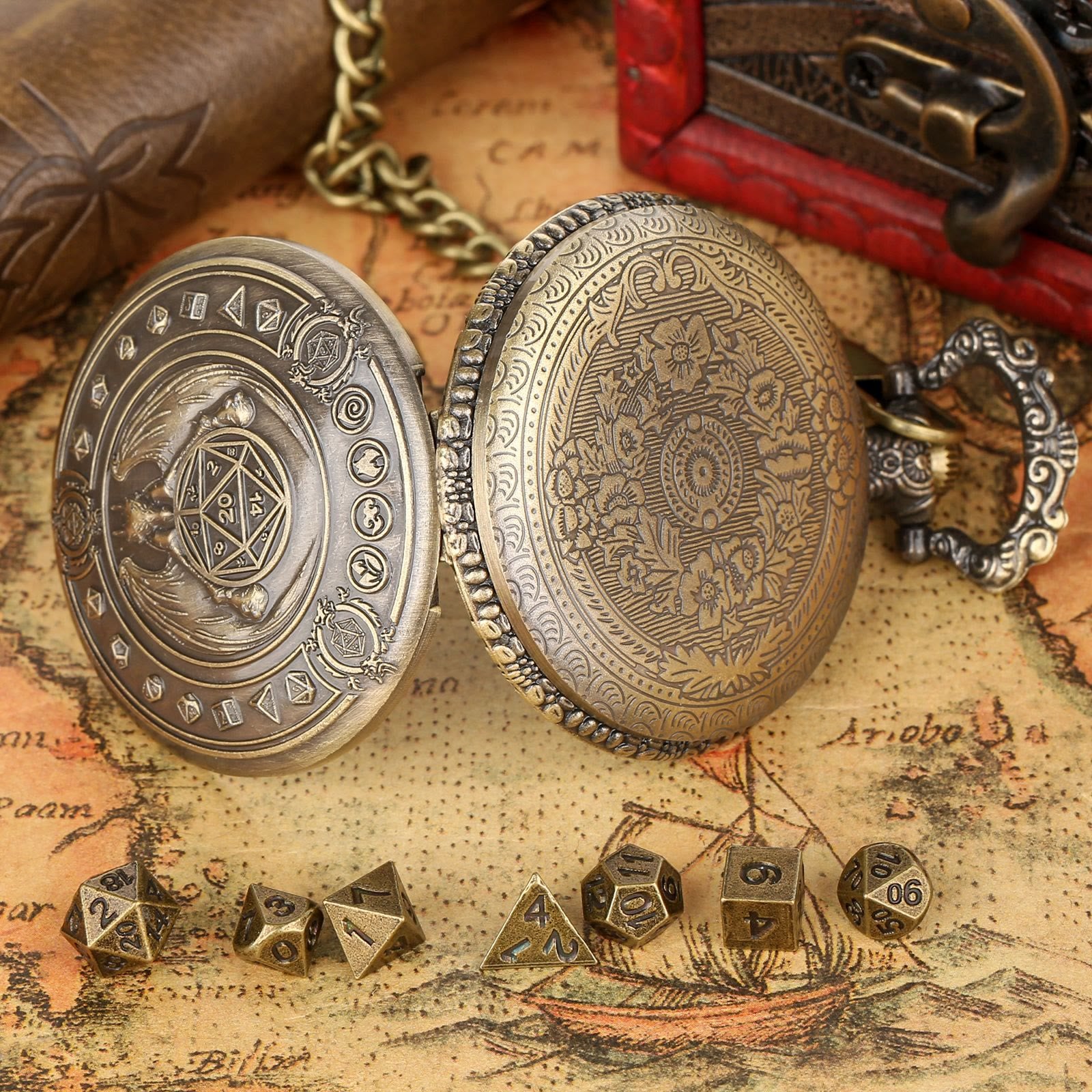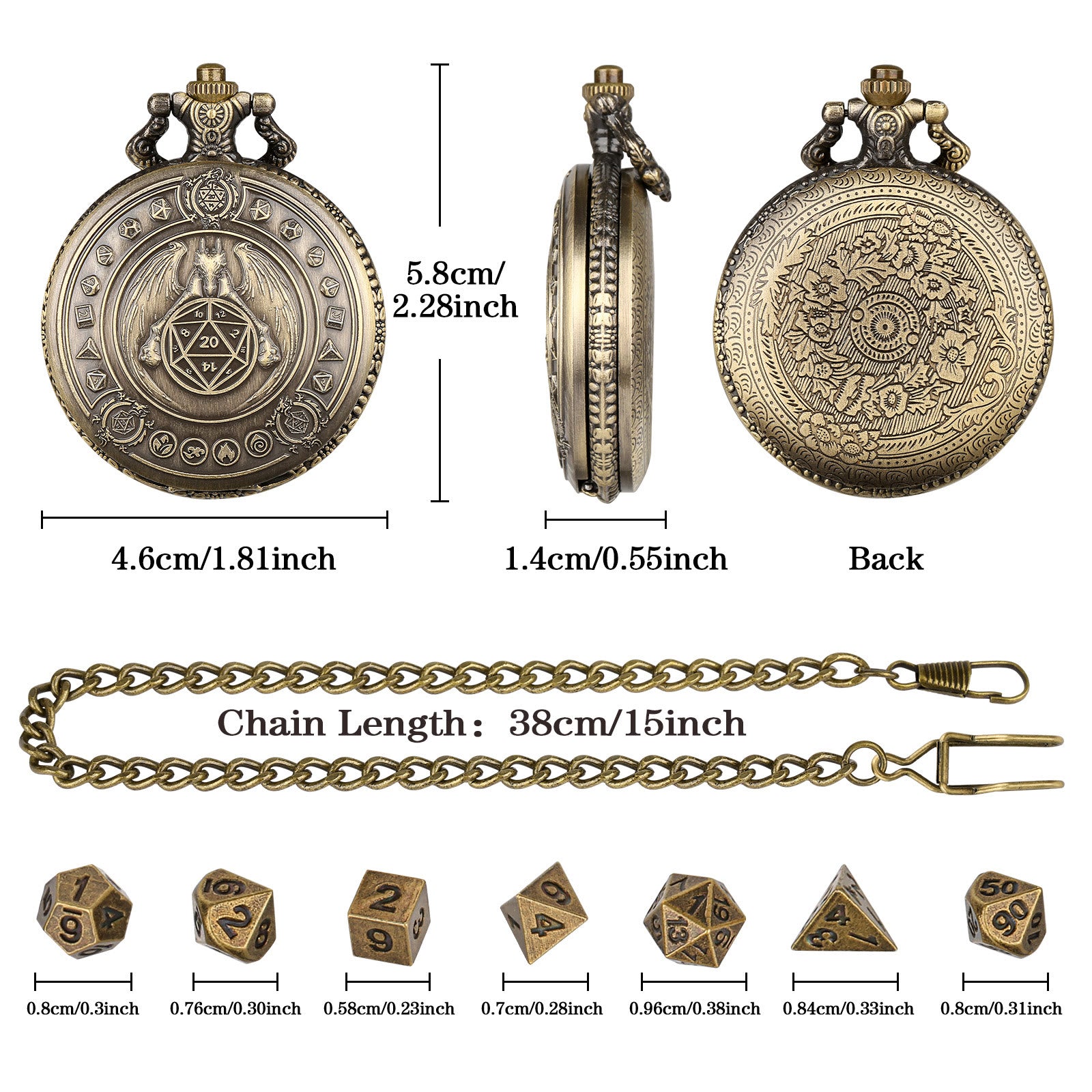 • Weight: 60g(1 x Pocket Watch Case , 1 x Chain , 7 x Dice)