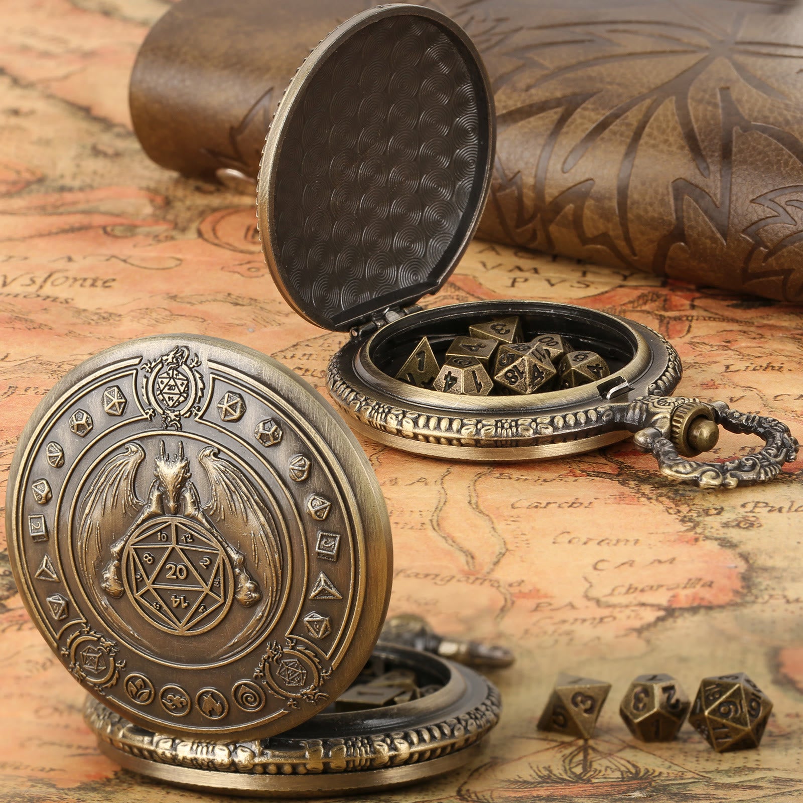 WorldNorse Norse Dragon Polyhedral Dice Set Waist Chain - Pocket Watch Case + Chain + Dice - Gold - image 0